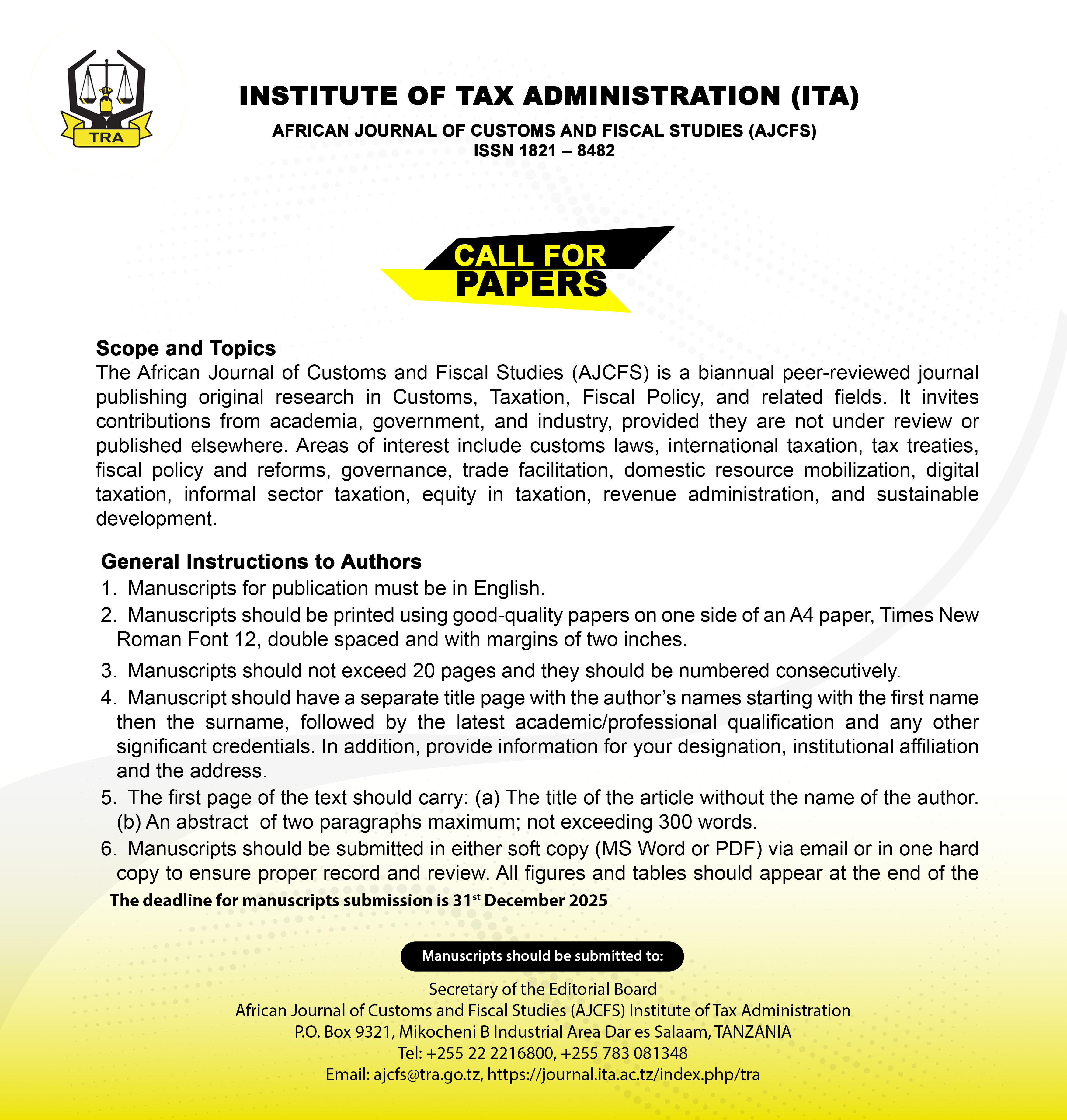The Institute publishes a scholarly peer review journal, The African Journal of Customs and Fiscal Studies (AJCFS) – ISSN 2665 – 0517 (print) and ISSN 2665 – 0519 (online). The journal is published annually and has a scope broadly interpreted to include such areas as policy, law and administration in customs, regional integration, international trade and taxation at different tiers of government. The AJCFS was formerly known as Journal of the Institute of Tax Administration (JITA) which was published biannually focusing on the same areas as the current journal.